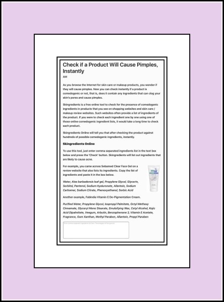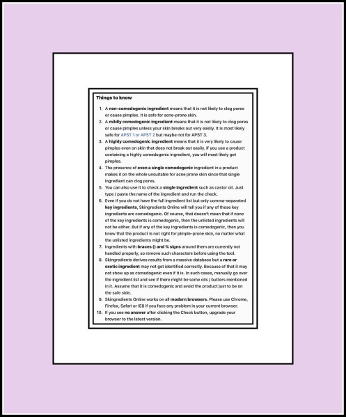 The 3rd company Thryve’s article mentioned is a company called Tula. Tula sells skin care products that are supposed to be extra healthy for your skin because they include probiotics in their ingredients. While they don’t have a line for acne per se, they have a line for oily skin. Using their ‘Contact us’ page I also emailed them to ask if any of their ingredients were comedogenic because my old method for determining this is so tedious. I was thinking someone should come up with a website where you could copy all of the ingredients that are in a product into a little box and they would check for you…and thinking maybe I’d even try to do that myself. So I Googled comedogenic checker and lo and behold discovered that someone has created a site for that.