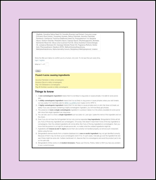 Notice at the bottom of the above screenshot…there’s a little text box? That’s where you paste the list of ingredients into. After doing that you’ll need to answer the math problem in the Captcha to make sure you’re a human and then you’ll see a nice printout of any comedogenic ingredients along with some helpful information about what that means.