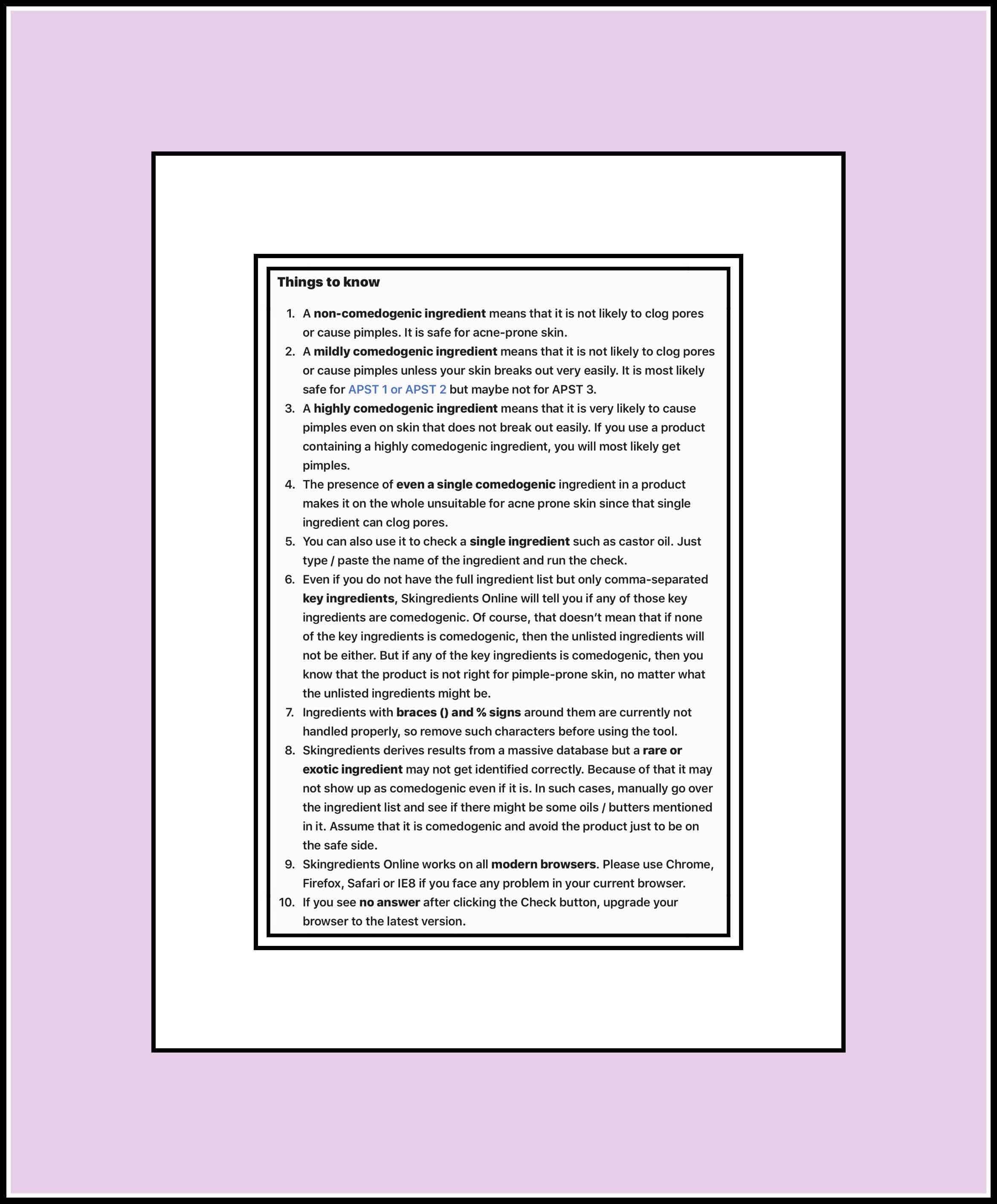 Notice at the bottom of the above screenshot…there’s a little text box? That’s where you paste the list of ingredients into. After doing that you’ll need to answer the math problem in the Captcha to make sure you’re a human and then you’ll see a nice printout of any comedogenic ingredients along with some helpful information about what that means.