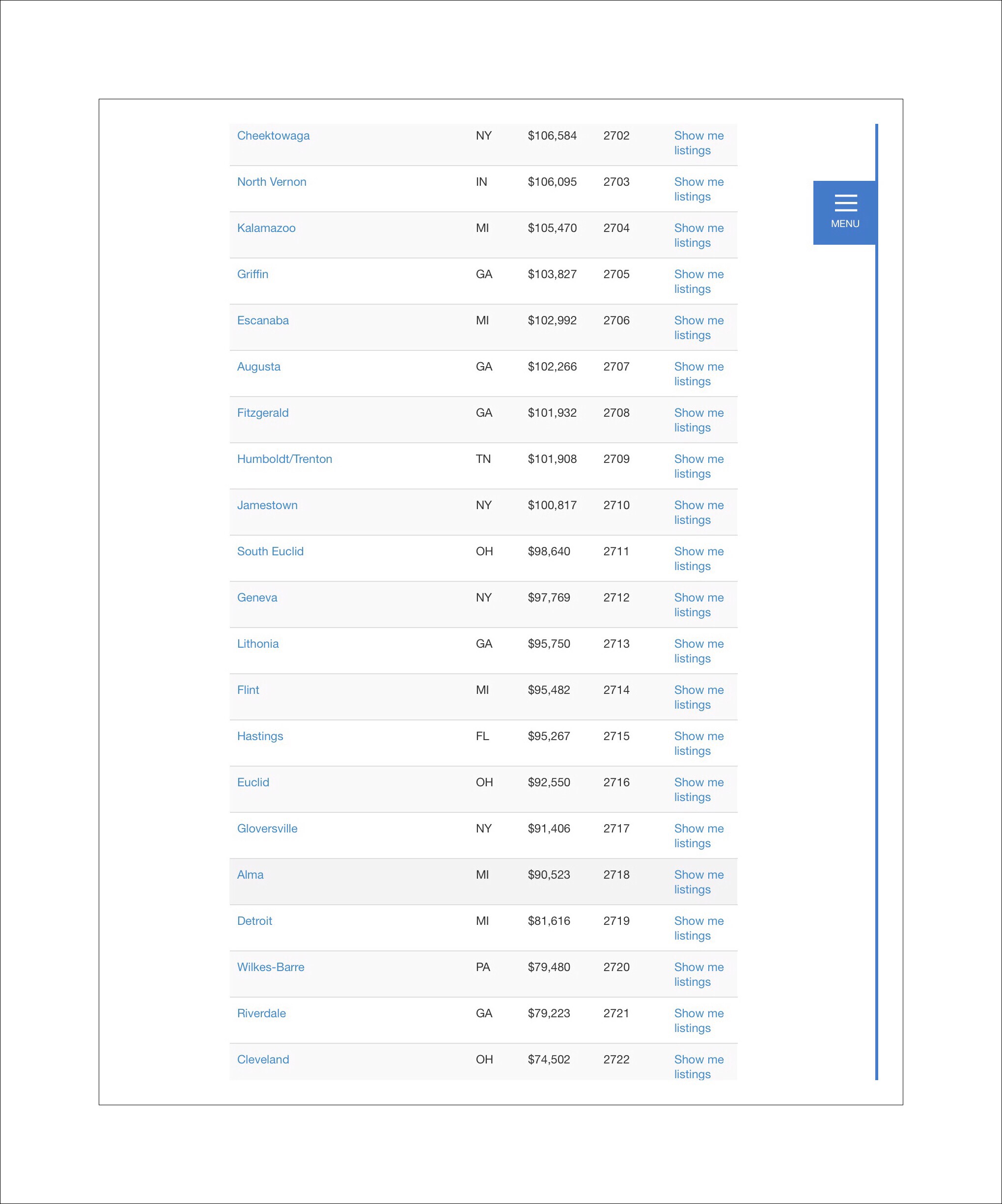 The list compares home prices in 2700 markets, and analyzes over 81,000 homes countrywide. The prices shown are based upon a 4 bedroom 2 bathroom home.
