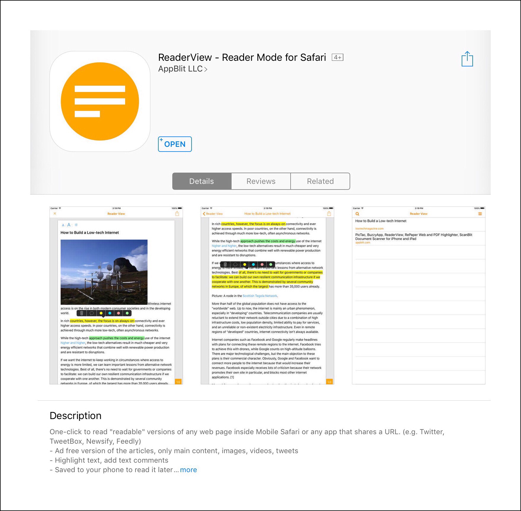 Actually ReaderView | Reader Mode for Safari & RePaper Web & PDF Highlighter are their full names. Both apps were designed to make Web content more accessible and more readable, and both are great as an intermediary for saving nice, clean, ‘ad-free’ versions of things for offline reading.
